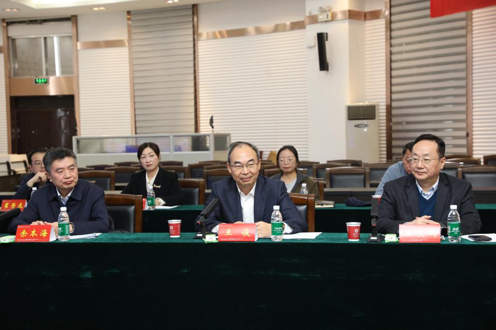 余本海向王俊院士和参会人员介绍了我校50周年校庆各类学术活动进展情况,他表示,学校通过举办一系列高水平学术论坛,旨在促进广泛的思辨交流与智慧碰撞,为学校高质量发展汇聚宝贵的智力支持与精神力量。